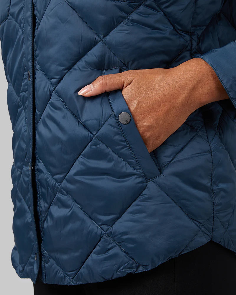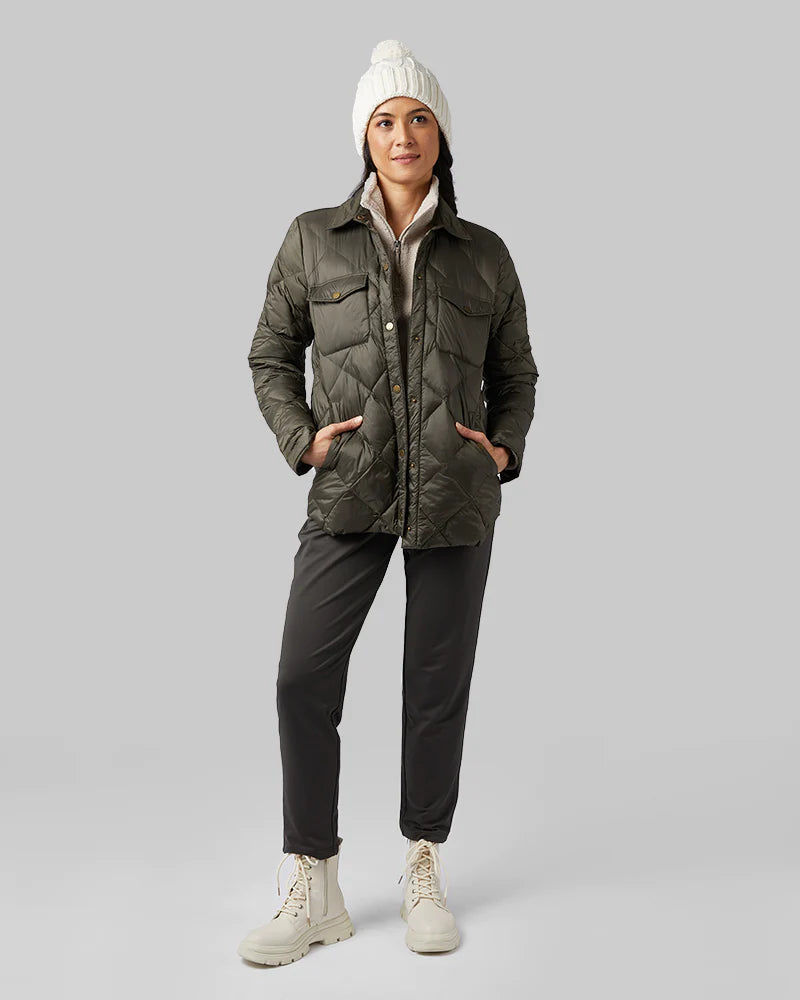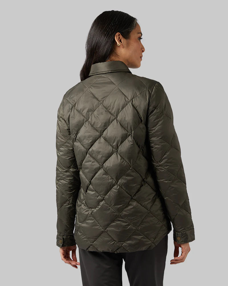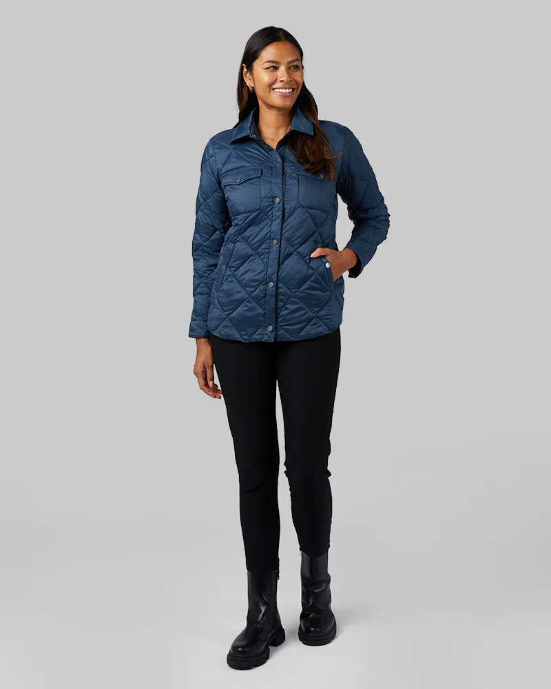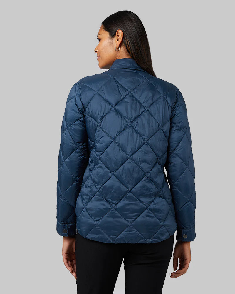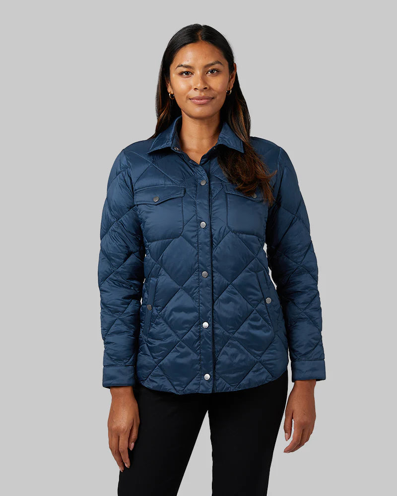 This women's lightweight shirt-jacket blends style and functionality. Crafted with a 100% nylon shell, quilted body, chest patch pocket, and hand pocket welts, this stylish jacket is expertly insulated with Cloudfill and 550-650 Fill Power for lightweight warmth. Finished with a tag-free label for comfort. Imported.
